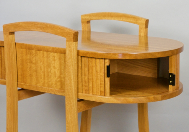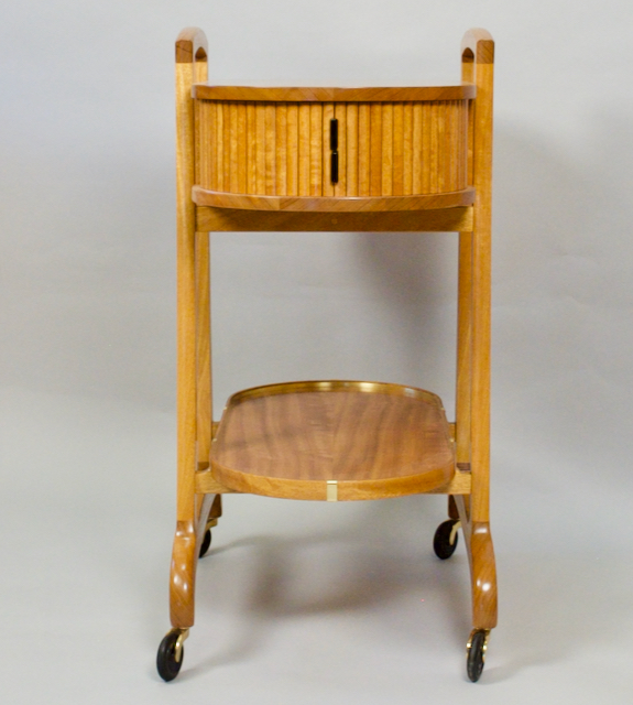 This cocktail cart features four tambour doors made with iroko slats and ebony handles.